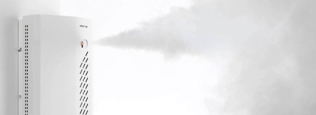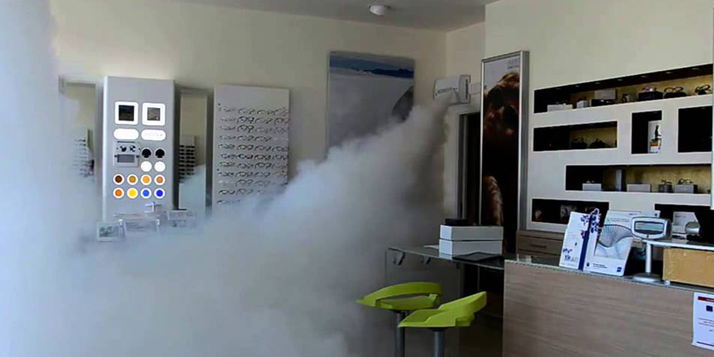 Sistema de seguridad capaz de saturar en pocos segundos el medio en que esta instalado, lanzando en el ambiente una densa niebla que hace la visibilidad nula.